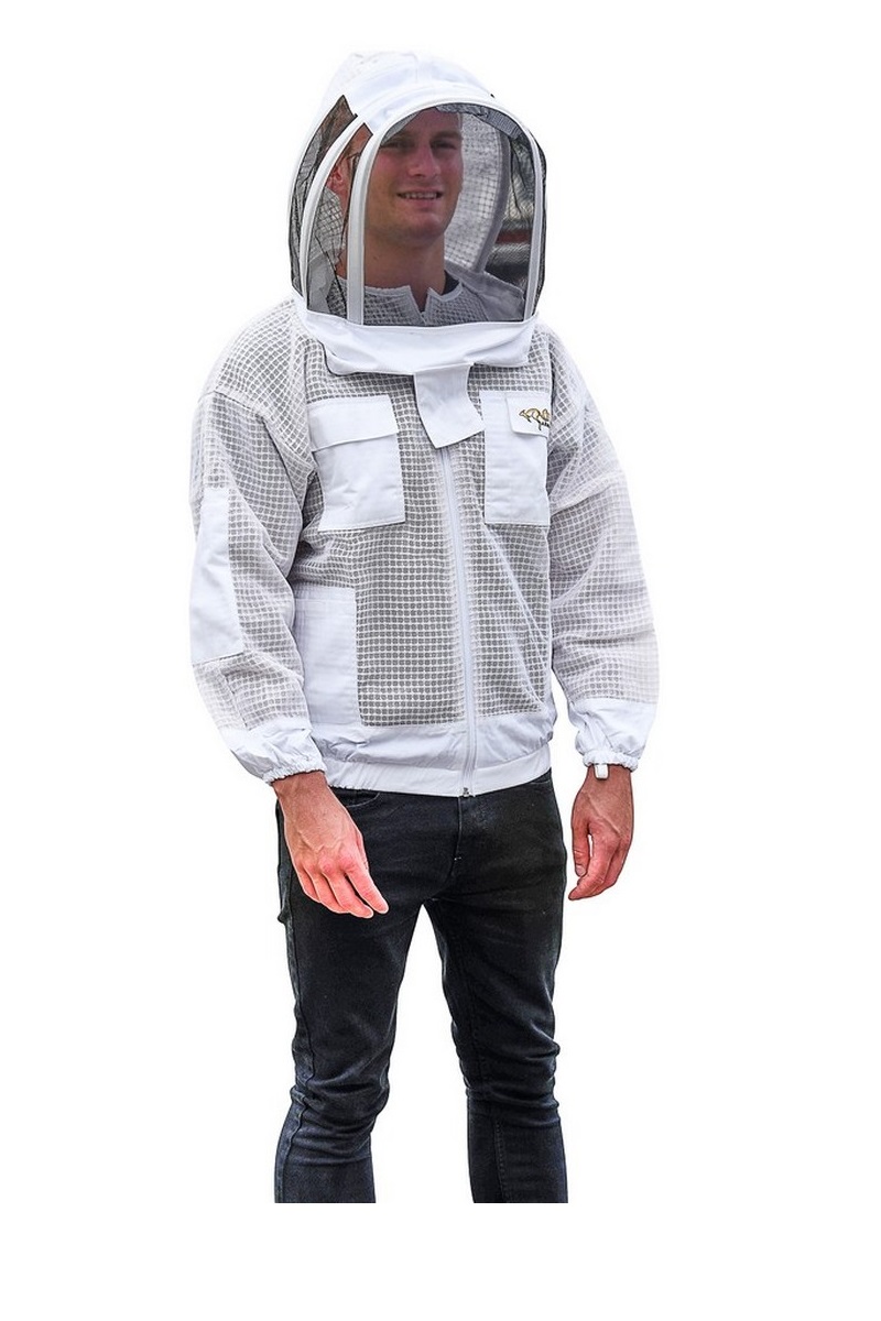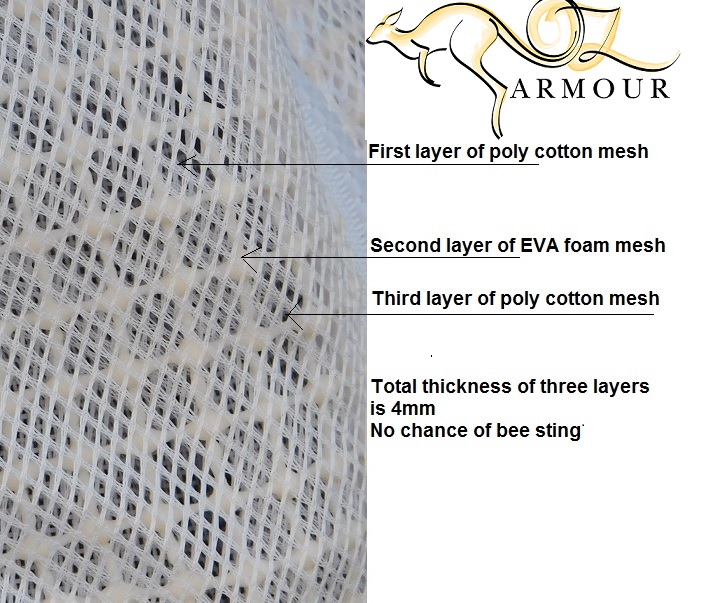 The triple layer ventilated jacket provides the best protection against stings. The first layer is a cotton mesh, the second layer is an EVA foam and the third layer is another cotton mesh; providing a 4mm thickness away from the skin. Simply wearing a t-shirt underneath will allow the breeze to flow right through.
