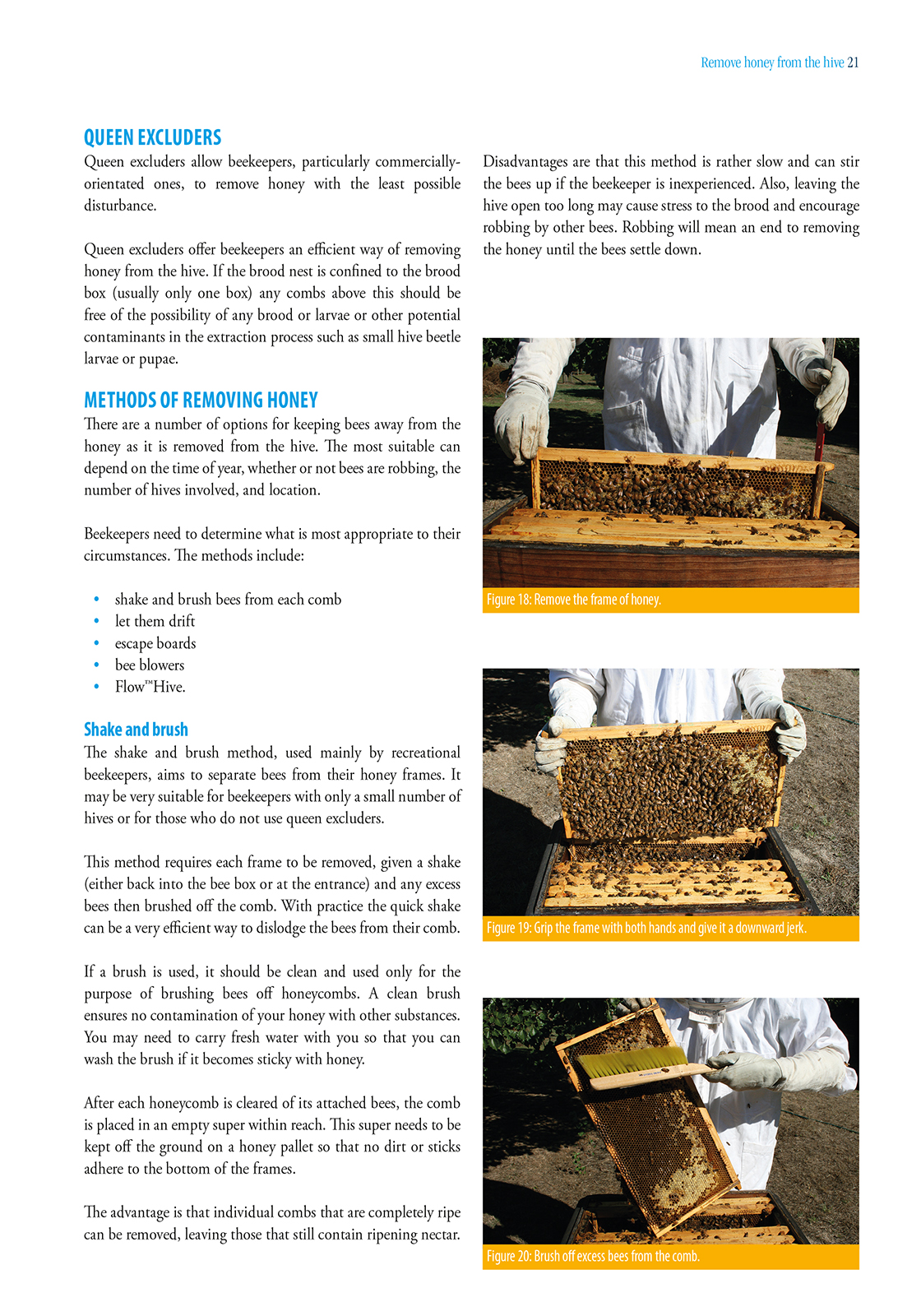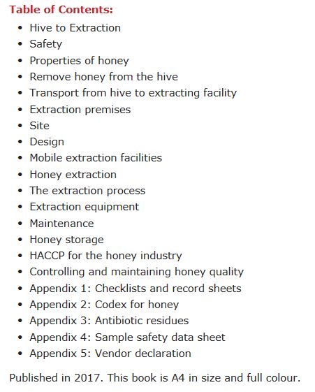 This book informs beekeepers of best practices to honey extraction. It also informs beekeepers of the threats to honey quality which can occur through poor handling skills or poor design of facilities. It includes references to legislation about food production..