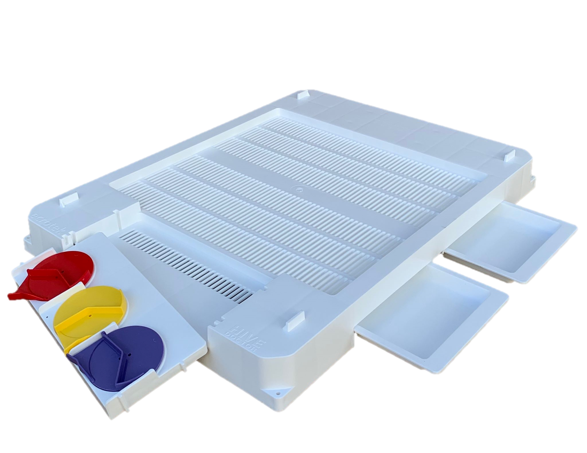 The Hive Doctor bottom board is adaptable, functional and made of UV resistant white plastic for stability and sturdiness. It is equipped with integrated slide out beetle trays for control of small hive beetle and a triple disk swivel entrance, allowing the beekeeper the choice of entrance options.