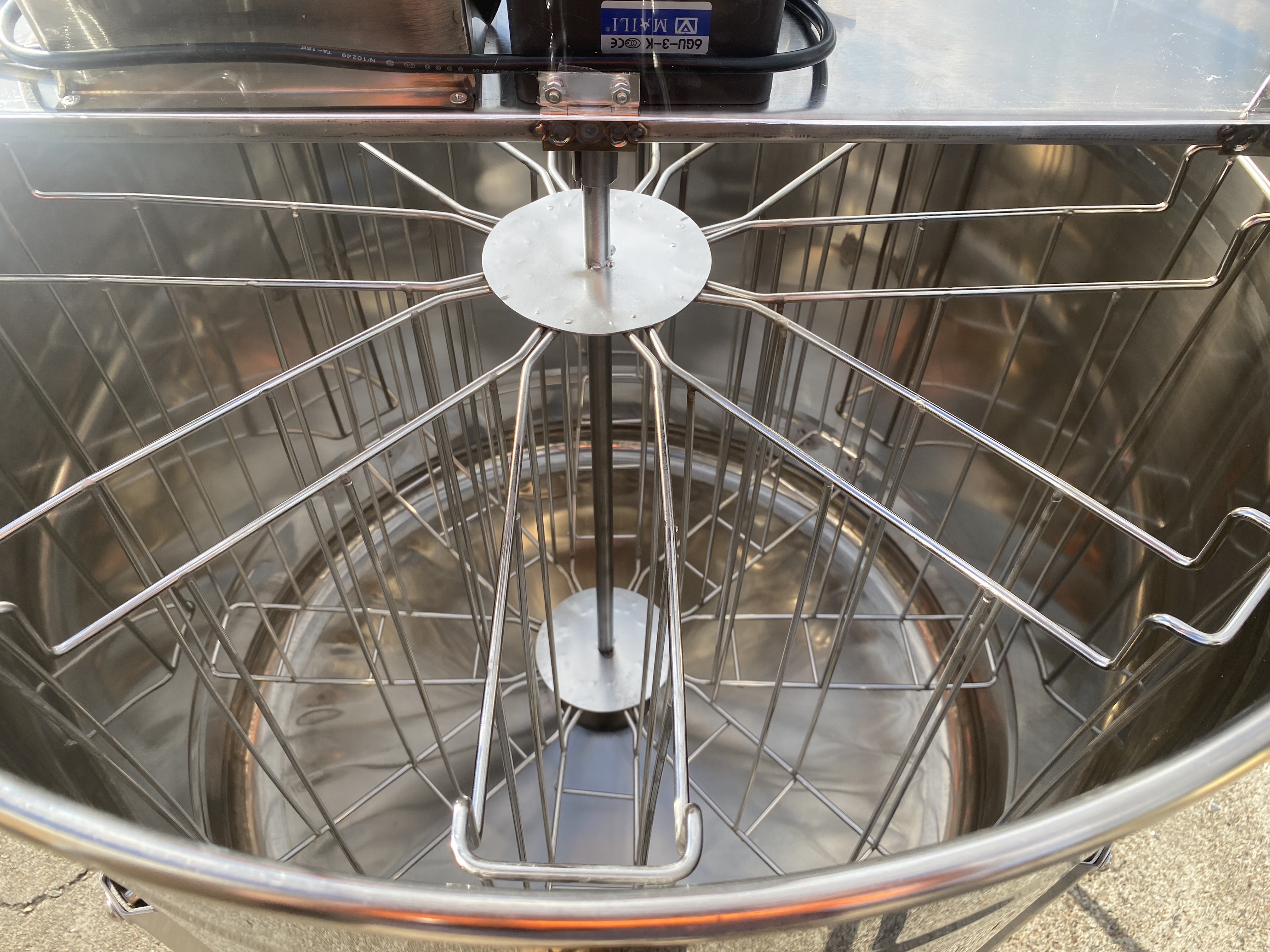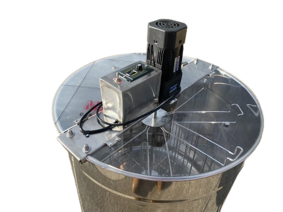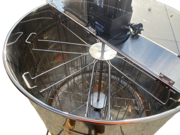 This 8 frame stainless steel motorized variable speed Radial extractor saves your arms. It is on legs high enough to place a 10 Ltr / 15 Kg bucket under the outlet.